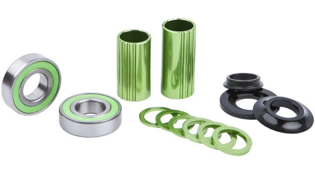 Das Mid BB Tretlager mit zwei Hülsen zum Anpassen von 68mm oder 73mm und ein Satz Alu Spacer. Die Hülsen sind CNC gefräst um das Gewicht so gering wie möglich zu halten. Zudem wurden die Hülsen und die Spacer mit einem schönen eloxierten Grün verfeinert.