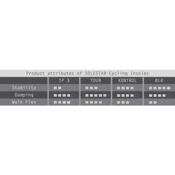 Beim Radfahren ist es wichtig, dass der Fuß in seiner Neutralstellung bleibt. Das garantiert der spezielle Aufbau der Solestar Einlegesohle Kontrol: Hier führt ein Stabilisationsdelta den Fuß über 3 Punkte exakt in die Neutralstellung und hält ihn dort. Ein belastungsstabiler und steifer Kern aus Black Fibre weist deutliche Vorteile auf, im Vergleich zu weichen Materialien anderer Einlegesohlen.